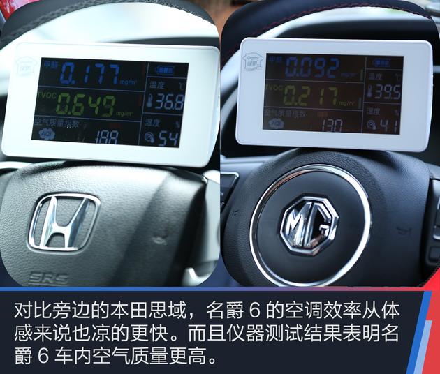 从今天短暂的体验来看,即便在正午时分进入车内,车内也没有任何气味,而且空调效率的确很高,能在很短的时间内让温度降下来。对比旁边的思域和昂克赛拉,名爵6的空调不仅在操作上更加方便,直观的体感来说也凉的更快。