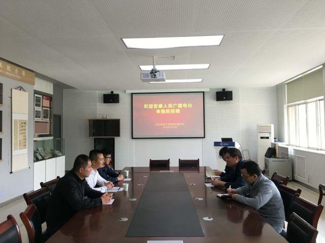 4月4日,安康人民广播电台FM95.9交通广播到我院进行专场招聘。上午10:30分,我院*党**委副书记刘驰老师、2018届毕业生辅导员张莉卓老师及研究生辅导员徐鹏老师一同在何微纪念馆接待了安康广播电台一行人。
