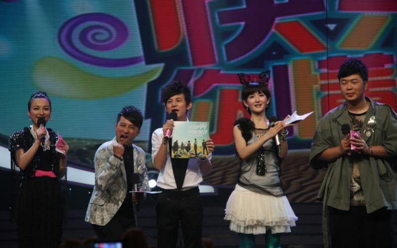吴昕(左起)、李维嘉、何炅、谢娜、海涛是知名的“快乐家族”成员。(中通社)
