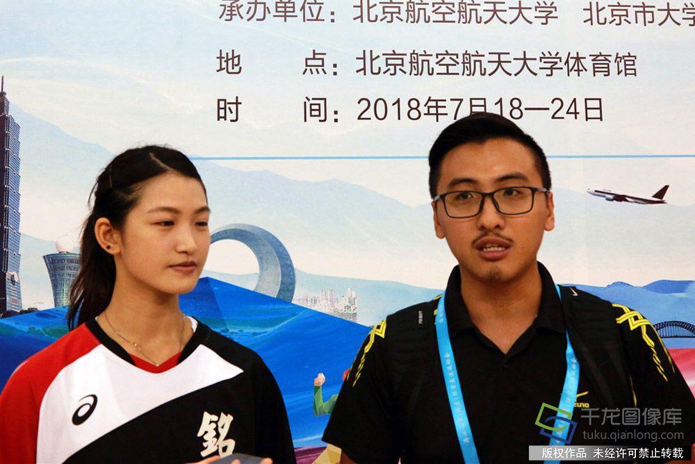 7月21日,海峡两岸(北京)体育沟通运动会女子排球比赛在北京航空航天大学沙河校区体育馆举行,图为台湾铭传大学排球队主教练林邑轩接受千龙网专访。千龙网 姜雪峰 摄