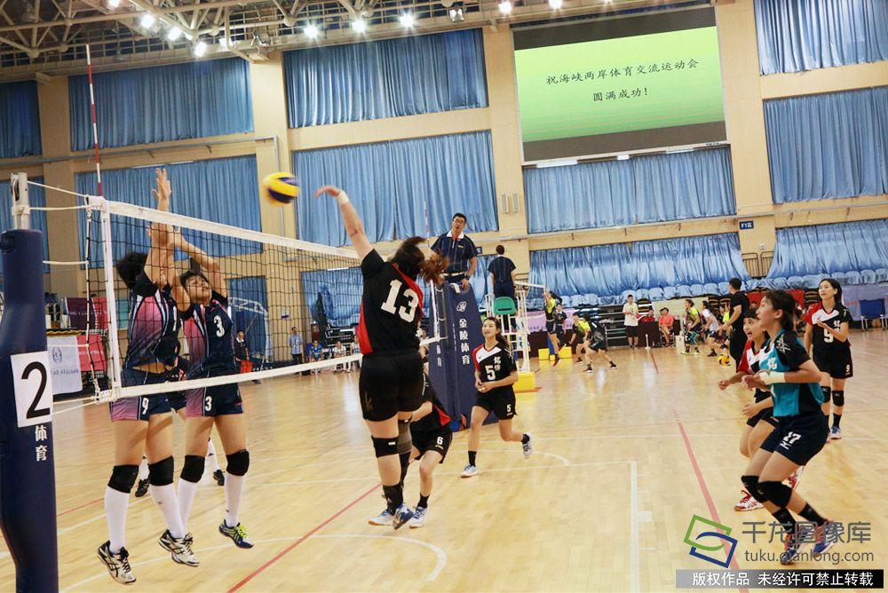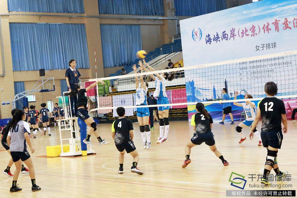 7月21日,海峡两岸(北京)体育沟通运动会女子排球比赛在北京航空航天大学沙河校区体育馆举行,图为比赛现场双方队员网上对攻。千龙网 姜雪峰 摄