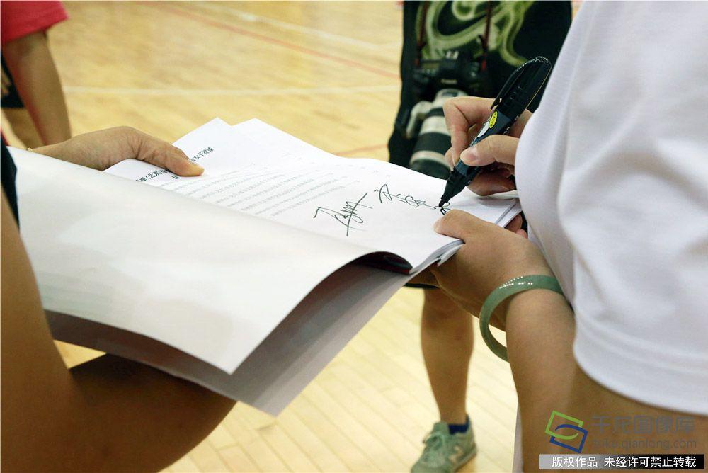 7月21日,海峡两岸(北京)体育沟通运动会女子排球比赛在北京航空航天大学沙河校区体育馆举行,图为比赛现场女排奥运冠军签名留念。千龙网 姜雪峰 摄