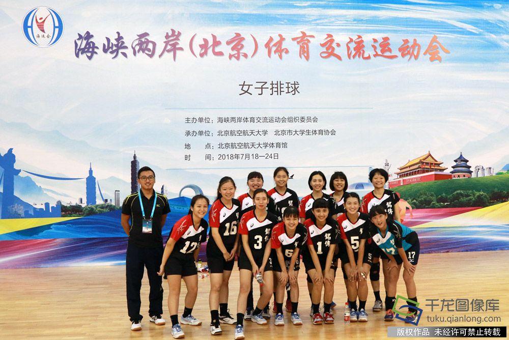 7月21日,海峡两岸(北京)体育沟通运动会女子排球比赛在北京航空航天大学沙河校区体育馆举行,图为台湾铭传大学排球队主教练林邑轩与队员们合影留念。千龙网 姜雪峰 摄