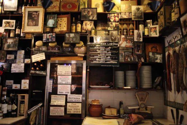 Cafe-bar Las Teresas是一家有年头的Tapas店,至今还能看出杂货铺的影子。数不清的火腿从天花板垂下,连同着发酵的香气和悬于半空的油份一起,*引勾**着人们的眼睛、鼻子和唾液腺。从小店墙壁上的各种海报和合照就能看出,这里是一家战斗力持久的“网红店”,而难得的是,在店里的30分钟,你仍然能看到周围居民的身影,他们或是来买一罐凤尾鱼,或是喝上一杯Fino配上几片火腿和芝士,这是一天中任何时段都能享有的,美食时光。