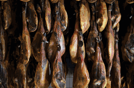 哈布果(Jabugo)——全世界最美味火腿的发源地,如今顶级伊比利亚火腿的代名词。这个阿拉塞纳(Aracena)自然保护区里偏僻的小山村,夹在安达卢西亚首府塞维利亚与葡萄牙首府里斯本的必经之路上。走进村子,山风吹过,空气中萦绕着一阵火腿甘香,世居在此的2000多居民,祖辈传承制作火腿,而这一切刚好发生在400年前。