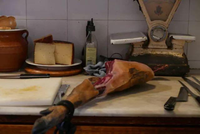 大城塞维利亚里没有一家Tapas酒馆胆敢不提供火腿,开业超过200年的老字号“Las Teresas”,进门抬头整个天花板都布满了悬挂火腿的铁钩,墙上摆着历代店主曾使用过的十几把片肉尖刀,在未有汽车交通之前,冬天从哈布果运来的黑标伊比利亚火腿就是小店一年的财富。几个世纪间,码头水手、独裁军、探险家、旅行者……世界每个角落的人都可以走进这间小店,人潮鼎沸,酒杯交叠,气温升高,高悬在吧台上的火腿便开始渗出油花,脂肪在暗处金光闪烁,油香散落在每个人身上,嵌入陈旧黝黑的墙壁之中,成了西班牙最难忘的记忆。