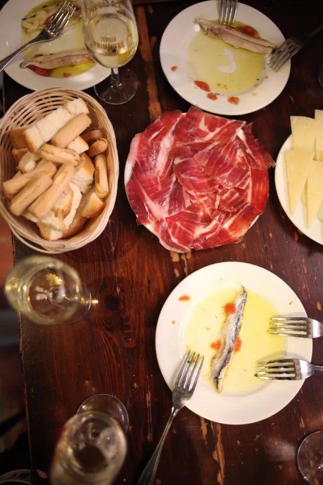 在塞维利亚皇宫和教堂周围的小巷子里,藏着数不清的Tapas餐馆;这其中有的是游客打卡店,也有一些是本地人的私藏。和巴塞罗那式的Tapas餐厅将食物琳琅满目地罗列开来不同,塞维利亚的Tapas更像是古早的风味和形式:杂货店将自己招牌的食物以小碟菜的形式贩售,提供给喝酒聊天的人们一个“盖子”(Tapas本意为盖子,放置灰尘进入酒杯)。