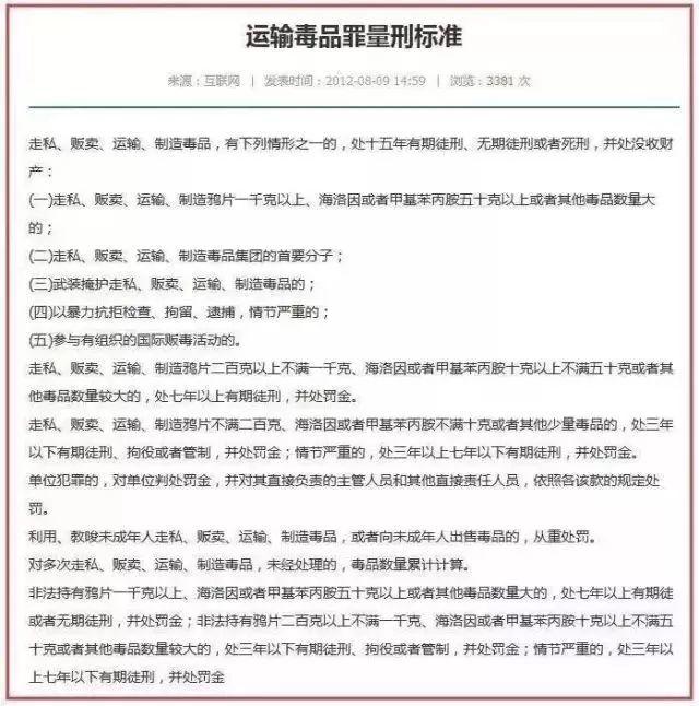 附上中国海关的运输*品毒**定罪标准↓↓ ↓