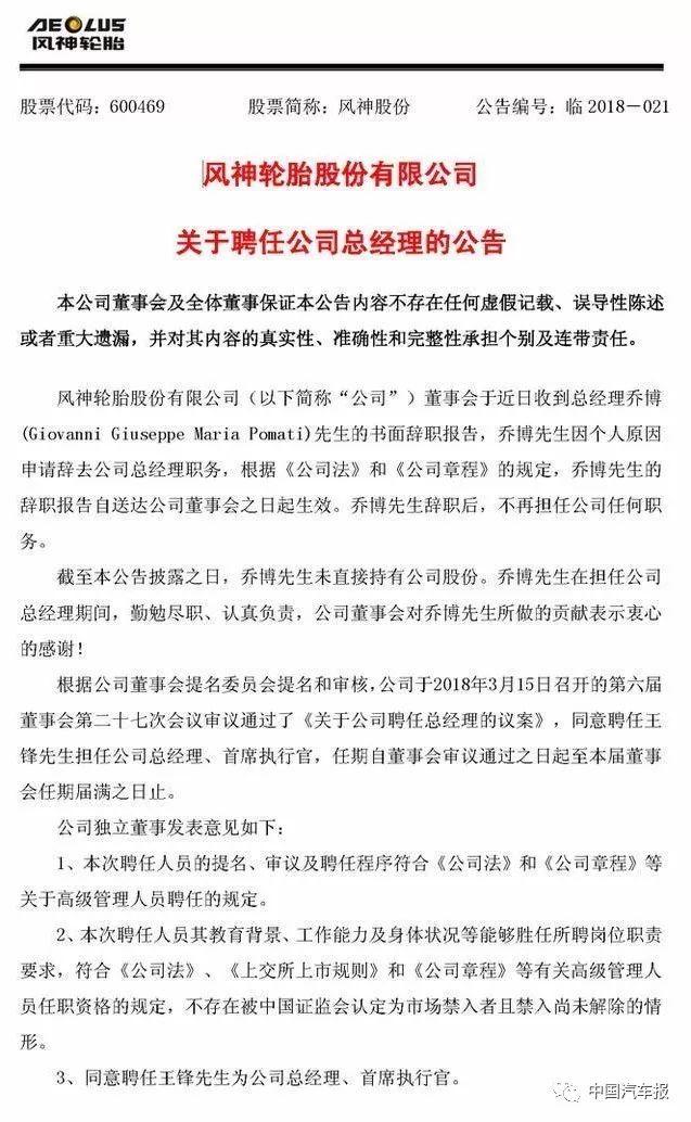 3月16日,风神发布《关于聘任公司总经理的公告》称,风神原总经理乔博(Giovanni Giuseppe Maria Pomati)递交了书面辞职报告,不再担任公司任何职务,同时聘任王锋担任公司总经理、首席执行官。
