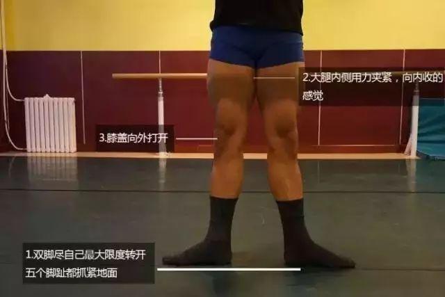 1.双脚外开,脚后跟保持一个脚距离,膝盖向内压,身体直立,双手扶墙。(脚掌平铺地板,屁股收紧。)