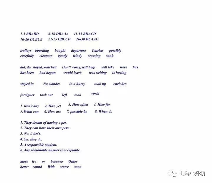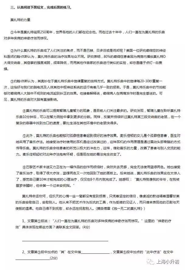 今年英语试题题型方面没有明显变化,仍然是两篇文章的阅读理解,听歌跟唱,看图口头作文,但难度进一步加大,没有点额外的英语底子只按照正常上课的内容考上外附中120……还是难度很大的!