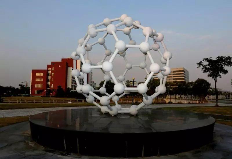 化学实验楼东侧,伫立着一个白色镂空的“足球”,原来,它的学名叫做碳60分子模型。碳60的分子又称“足球烯”,具有超导、强磁性、耐高压、抗化学腐蚀等许多优异性能,在光、电、磁等领域均有广泛的潜在应用前景。雕塑基座的铭牌上,刻着1996年诺贝尔奖化学奖获得者、碳60的发现者、华东理工大学荣誉教授罗伯特·柯尔的题词:“一次独具慧眼的参观开启了通往一个全新世界的门,我衷心祝愿华东理工大学的师生们找到他们自己的门。”