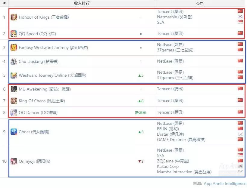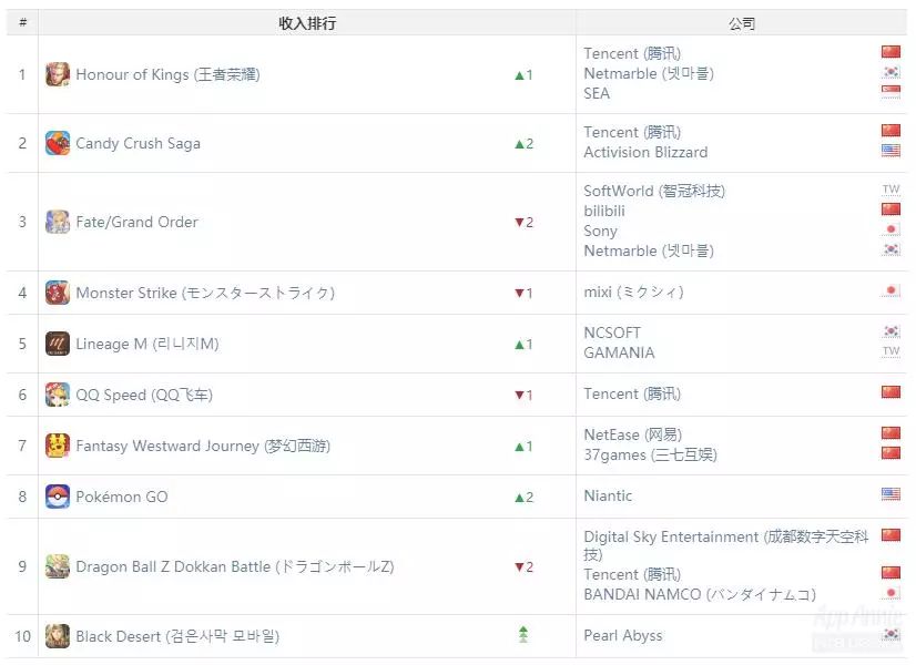 虽然在企业收入榜单中,国内厂商大洗牌,但是在单App收入榜中,本月却被腾讯和网易瓜分了前十。其中,腾讯《王者荣耀》《QQ飞车》《奇迹:觉醒》《乱世王者》和《QQ炫舞》分别占据了收入第1、第2、第6、第7和第8的位置。剩余的排名分别被网易《梦幻西游》《楚留香》《大话西游》《倩女幽魂》和《阴阳师》所占据。而上月还在榜单中的FGO也暂时被挤出榜单。