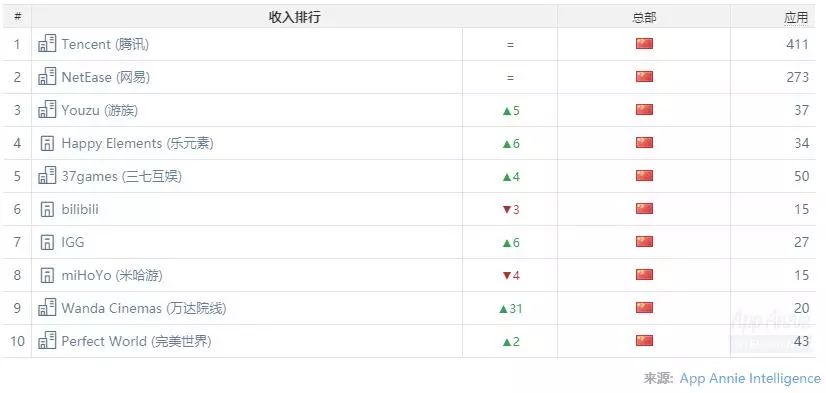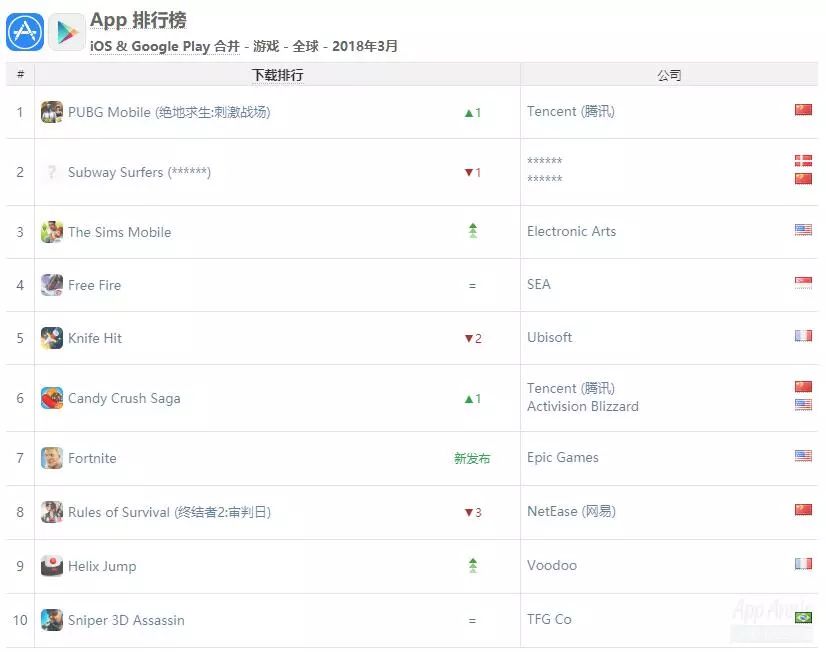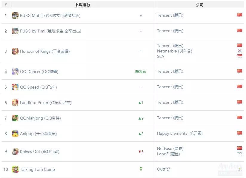不过在*载下**榜上,腾讯则是占据了领先优势,除了乐元素《开心消消乐》、网易《荒野行动》和Outfit7《汤姆猫战营》之外,也很难再看见其它的产品出现。