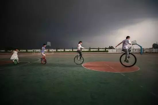 2015年4月28日,福建泉州,独轮车老师,骑着大轱辘,一个个轱辘递减,最后的一年级的小女孩骑着最小的独轮车,在老师的熏陶下,学校的孩子们爱上了独轮车运动。/资料图片
