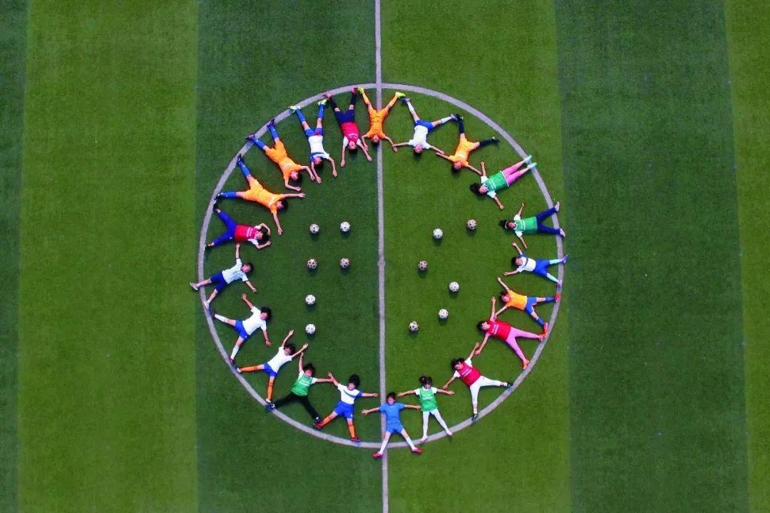 2017年6月15日,山东省济南市,全国青少年校园足球特色学校之一的盛福实验小学的孩子们围成一圈,中间用足球拼成了该校校名首字母。/*党**方庆摄