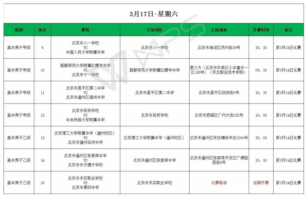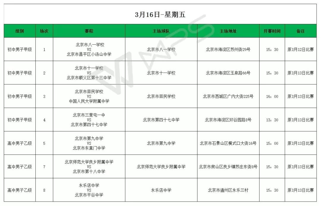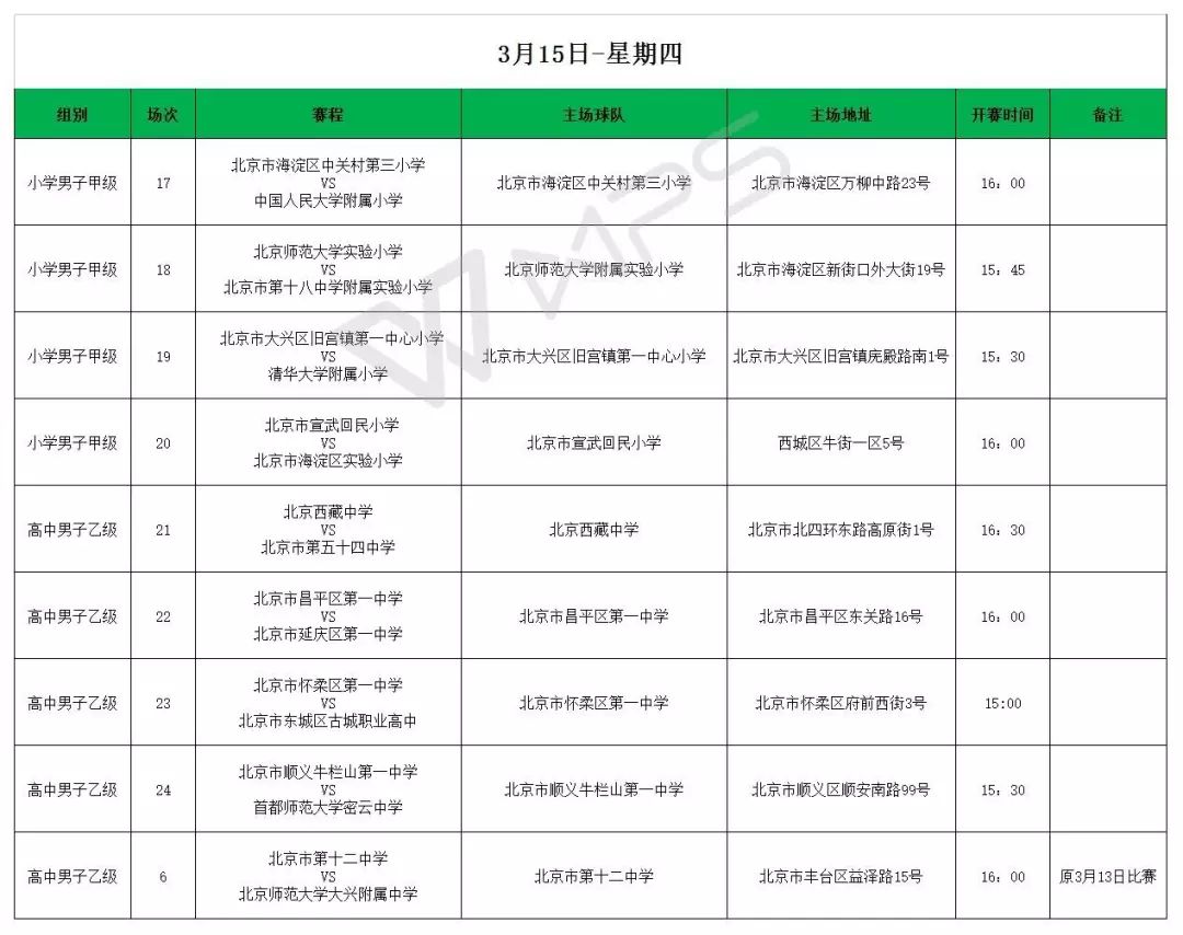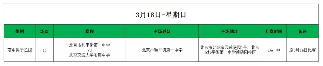 2018年北京市校园足球特色校(传统校)联赛暨耐克校园足球联赛第一周第一轮赛程出炉!本届赛事,小学男子组甲级和高中男子组乙级率先于3月15日开打。紧接而来的是初中男子甲级、高中男子甲级的比赛,将分别在3月16日、3月17日揭开大幕。