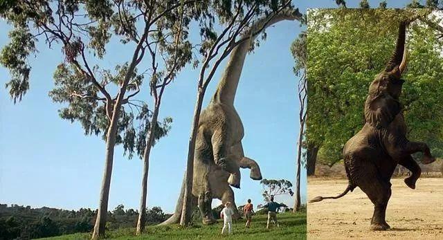 设计师还从各种动物身上取材恐龙的运动模式。比如《侏罗纪公园》中首个出场的腕龙是影史上第一只完全由电脑特效制作的生物,它两腿离地、仰天咆哮的动作,就取自大象。