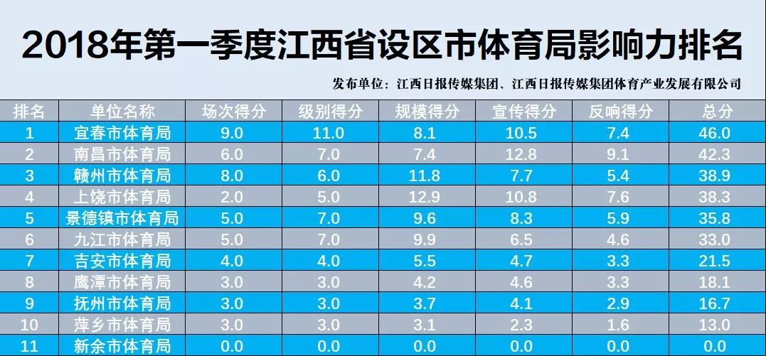 ※《江西省设区市体育局影响力排行榜》,反映的是各地体育活动的开展,是否接地气,有人气,涨士气,在广大群众中,是否有认知度、有参与度、有认可度;与各设区市体育局其他工作业绩无关。
