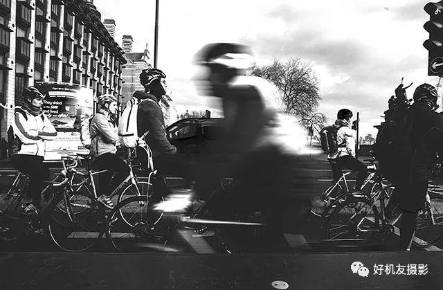 这幅照片想要表现的并不是某个人,更重要的是展现一种伦敦街头骑行的氛围。相对较慢的快门将前景的骑车人虚化,形成了一种动与静的对比。