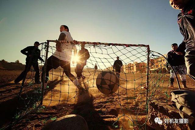 摩洛哥一个偏远城市的街头,清晨的阳光非常好,一群人在兴致勃勃地踢着足球。逆光会强化整个场景的质感,特别是尘土扬起时,整个画面都是金灿灿的。场地很大,而在球门后拍摄到精彩画面的机会比较高。