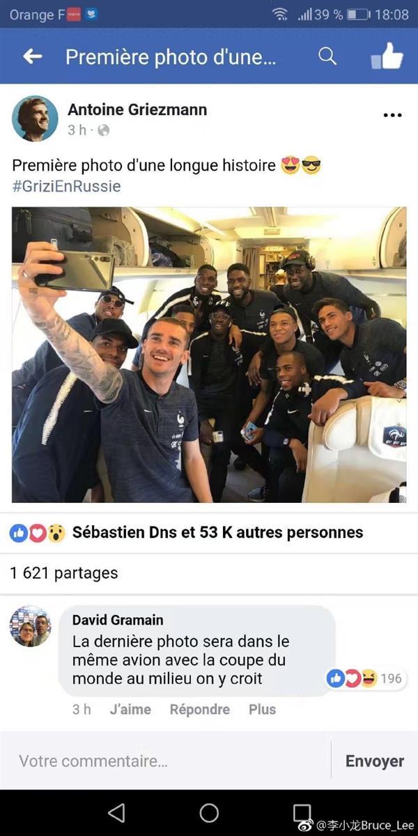 日前,法国队头号球星“格子”格里斯曼,在社交网络上晒出了法国队出征前在飞机上合影的照片。照片中,格里兹曼满面笑容为法国队员拍摄全家福,看起来对手机的拍照效果颇为满意。有细心网友发现,“格子”使用的手机,正是DxOMark拍照排名第一的华为P20 Pro。