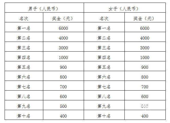 1、半程马拉松男、女选手分别获得奖金(单位:人民币)
