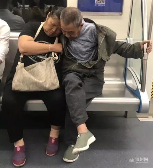3.在成都地铁1号线上,老奶奶困意袭来歪头睡着,身旁的老伴儿便用肩膀当枕头、身体做靠垫,一路支撑着她。