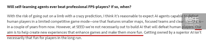 负责这项训练的人工智能实验室表示,他们的目标不是为了创造出能击败人类的AI,而是创造能给玩家带来更多快乐体验的AI,为了达成这一目的,AI太过“厉害”显得没什么必要。