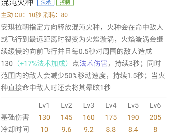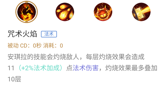 被动:安琪拉的技能会灼烧敌人,每层灼烧效果会造成法术伤害,与法术强度有关,灼烧效果最多叠加10层。很多人都没有关注到安琪拉的被动技能,其实正是因为其被动技能,安琪拉才能在短时间打出高额伤害。虽说一层灼烧的伤害较低,但是积少成多,当叠至10层的时候就完全应发了质变。一技能完全命中可以叠5层,二技能每次0.5s可以对周围敌人叠一层,三技能每0.3秒可以对命中敌人叠一层。