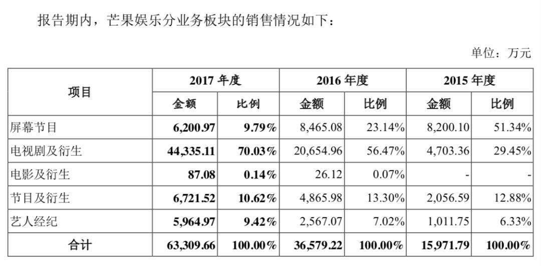 2017年芒果娱乐的6.3亿总营收中仅电视剧就占了70.03%,2016年电视剧贡献营收2亿元,占总营收的56.47%。