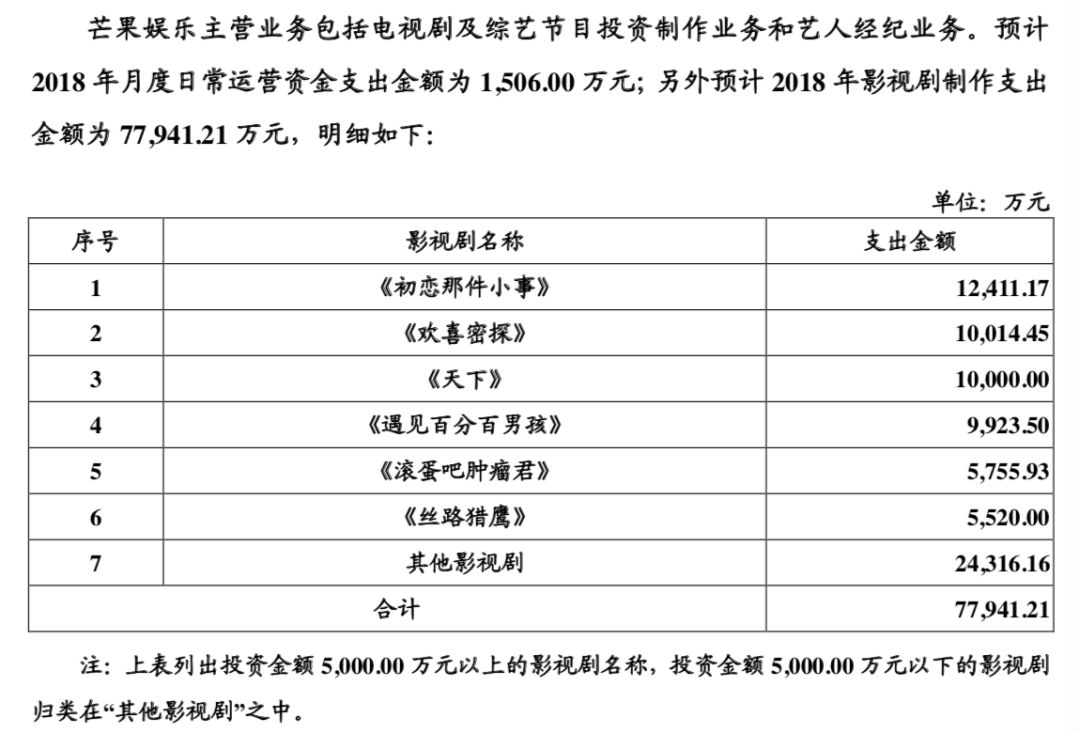 为了推进内容向大制作精品剧升级,芒果娱乐在挑选制作团队和投资项目上眼光独到,在资金投入上也毫不吝啬。据悉,2018年,芒果娱乐拟投入7.8亿元参与出品《初恋那件小事》《遇见百分百男孩》《丝路猎鹰》等剧集。