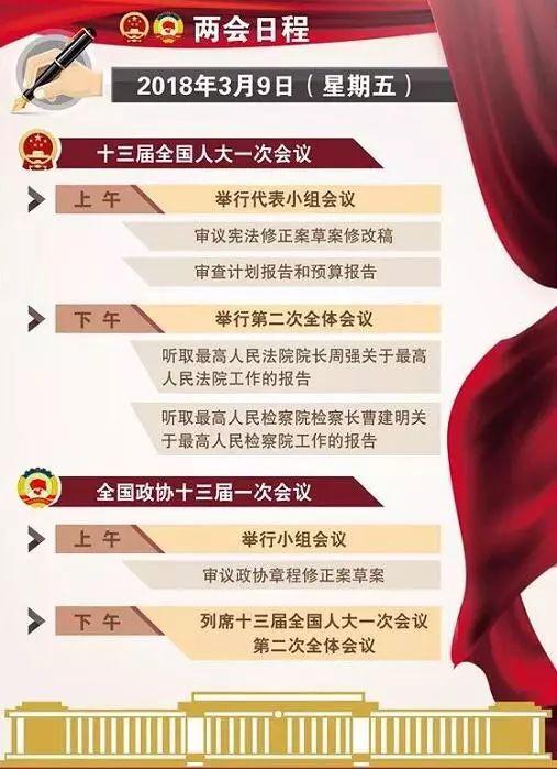 ·*会两**日程预告|十三届全国人大一次会议9日上午举行代表小组会议,审议宪法修正案草案修改稿,审查计划报告和预算报告。下午3时在人民大会堂举行第二次全体会议,听取最高人民法院院长周强关于最高人民法院工作的报告,听取最高人民检察院检察长曹建明关于最高人民检察院工作的报告。