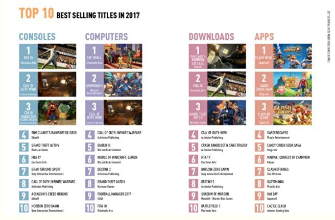 2017年,《FIFA 18》是意大利市场收入最高的主机游戏,《模拟人生4》则在PC平台排名收入榜榜首。《彩虹六号:*攻围**》*载下**量最高,《皇室战争》是意大利苹果App Store全年收入最高的游戏。