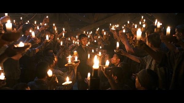 二是大家同意出逃后手里举起的烛光。用光代表众人的统一意志不是新鲜的手法,但这里用得恰到好处。单个普通人的力量只有区区烛光一样微弱,但团结在一起,那就能众志成城,点亮黑暗。这一经典镜头还在哈利波特与混血王子中出现过,食尸鬼夜闯霍格华兹,杀死了邓布利多。师生们发现了邓布利多的尸体和天空中食尸鬼召唤的骷髅云后,大家举起魔杖,微弱的光汇集成光束,驱散了黑暗的咒语。