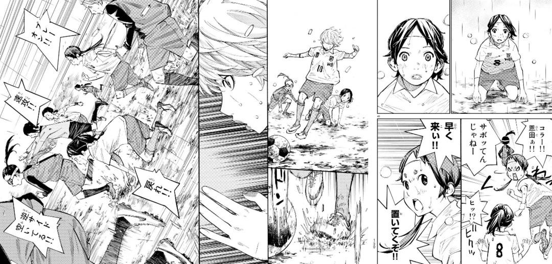不仅是射门描写得十分有吸引力,新川老师对瞬息万变的球场描写也是下足了功夫。在之后与浦和邦成一战中,恩田独自持球被破坏,后来跟上的周防等人以及回防的浦和邦成球员、一个个从跌倒在地的恩田与桐岛身旁经过,跑在最后的曾志崎还不忘怒斥恩田一句,赛场上大家拼搏、队友间细腻的感情尽显无疑。