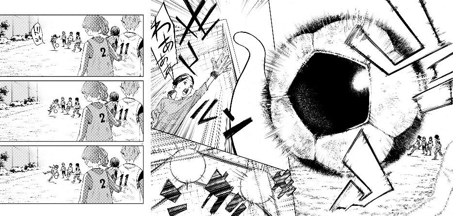 在蕨菜南最初对阵久乃木学园的训练赛中,新川老师就用很大篇幅详细描写足球动作,例如佃真央射门的连续分镜,把脚力惊人的佃真央极具魄力的一记射门描写得十分震撼。
