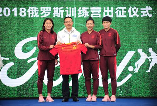 在出发仪式现场,中国女足队长吴海燕,以及球员王珊珊、古雅沙还上台与出征的小球员及教练进行了踢球互动。