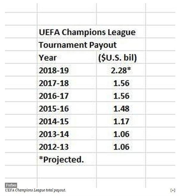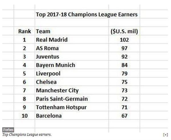 欧洲冠军联赛是世界上最赚钱的年度体育赛事,为团队价值增加了数亿美元。价值19.4亿美元的利物浦今年的价值增幅最大(30%),主要原因是2017-2018赛季和2018-2019冠军联赛的资金来源。再次,就像广播和赞助收入一样,冠军联赛的*率赔**也在上涨。