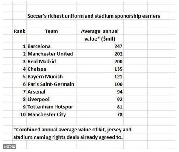 巴萨以每年1.16亿美元的价格与耐克公司达成了顶级服装代言协议。10件最有价值的球衣、配套和体育场冠名权每年总计达到13.5亿美元。现在有些球队正在出售他们制服的第三个部分的广告,比如袖标。阿森纳和切尔西近期都把袖标赞助卖出了好价钱,两家俱乐部分别可以因此得到每年1000万镑、1300万镑的收益。