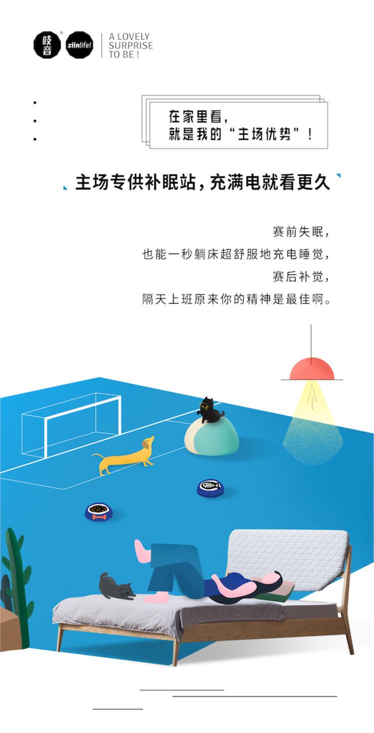 家居设计品牌 ziinlife 吱音上线世界杯营销,根据九成中国观众在家观看世界杯的洞察,制作了一系列在家看球的宣传海报。