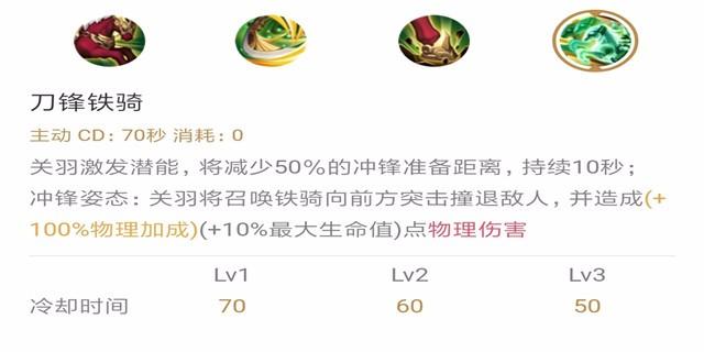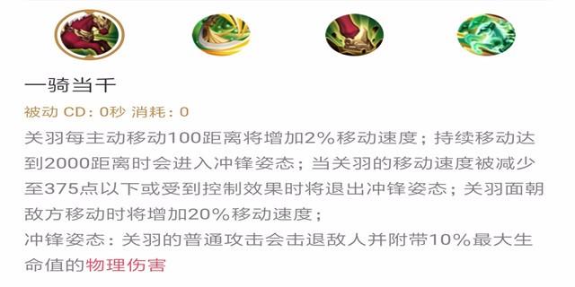 整体解析:关羽持续移动一段距离后会慢慢加速进入冲锋状态,并且向敌人移动的速度变快。而冲锋状态的普通攻击变成了击退,伤害和生命值有关。关羽的被动技能表示关羽在冲锋状态下的输出要远远高于这种非冲锋状态的输出,所以就要求关羽不断的进入冲锋状态,这个操作很考验玩家的左手的灵敏度。