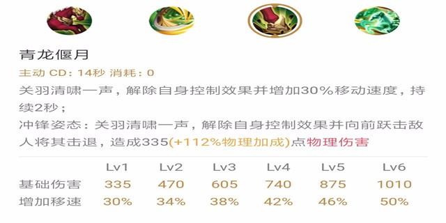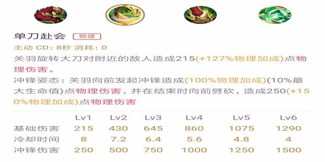 整体解析:这是关羽的主要输出技能。无论是非冲锋状态下的旋转大刀造成范围伤害,还是冲锋状态下的一刀劈,都能造成巨额伤害,对后排的威胁力非常大。在后期没有后排能承受住关羽两刀劈,而巨额伤害的缺点就是容错率低,这就考验召唤师的准度,有位移的后排是能比较轻松的躲过关羽这一刀的,所以我们最后在对方后排交出位移后再用这个技能击杀对方。