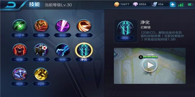 分析:关羽的机制决定关羽必须不断地保持在冲锋状态,而关羽在进团后面对敌方众多控制技能是很难通过走位全部躲过的,所以关羽携带净化,关羽进团后开启,能够让关羽免疫控制1.5秒,这段时间足够关羽对后排造成很大威胁了。