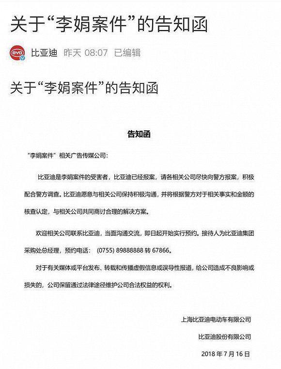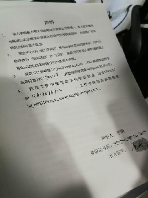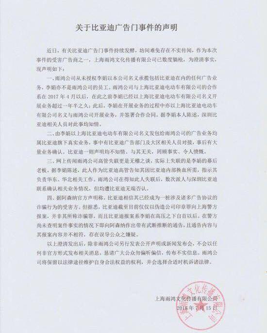 7月12日,比亚迪发布的声明中提到,“李娟使用上海雨鸿文化传播有限公司的名义,以自有资源(广告及活动)试用及免费使用为切入点,主动与比亚迪联系并展开广告宣传。”
