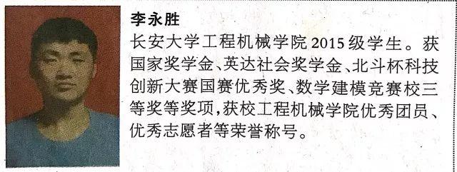 经严格选拔、评审,2017年本专科学生中,有约5万名优秀学生荣获国家奖学金。作为国家奖学金学生代表,我校李永胜同学的优秀事迹在2018年2月28日的《人民日报》上刊登。此次刊登的100人均是经各省(自治区、直辖市)和各高校推荐评选出的国家奖学金获奖学生中的优秀代表。展示他们的风采,是为了激励更多青年学生坚定理想信念、志存高远、脚踏实地,勇做时代弄潮儿,在实现中国梦的生动实践中放飞青*梦春**想,在不懈奋斗中书写人生华章。