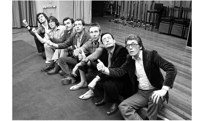 这年三月,英国人道格拉斯·亚当斯(Douglas Adams,上图最远处那个)写的一个广播剧在 BBC 四台开播,结果大受好评,除了被听众要求反复重播,还创作了好几部续集。这个广播剧的名字叫《银河系搭车客指南》(The Hitchhiker's Guide to the Galaxy)。