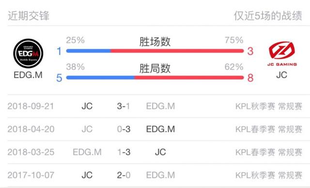 两只队伍一共交手4次,在2018年KPL秋季赛中,JC 3-1击败EDG.M。两队在之前的比赛中互有来回,在2018年KPL春季赛中,EDG.M3-0战胜JC,在之前JC也3-1打败过EDG.M。但是在新的赛季,JC引入了新的边路选手JC.Evildoer,打野选手JC.易峥。在体系上,JC变得更加多变,同时JC也补强了边路,使得边路位置作为队内的一个稳定点能够及时站出来。中路JC.青浪的表现也十分突出。EDG.M并没有进行大的人员调整,在边路位置上将EDGM.阿楚和EDGM.无痕进行轮换。但是在比赛场中的表现不是令人满意的。