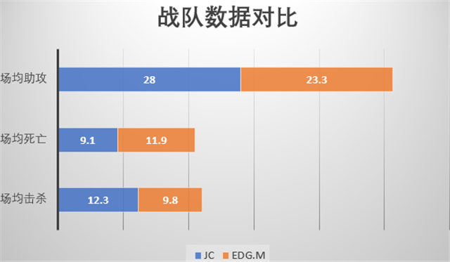 JC在场均击杀上是联盟的第一位,与EDG.M相比差距比较大。在场均死亡数上,EDG.M位于联盟第十二位,说明EDG.M在团战中经常发生团战损员或者说沟通不及时,不必要的伤亡的情况。在这一点上,EDG.M要加强队内的沟通,谨慎团战的站位,不要给敌方机会。JC在新赛季,打团的走位和细节都做的很好,团战基本上是以“能打赢的就打,打不赢就避战”的思路来进行的。