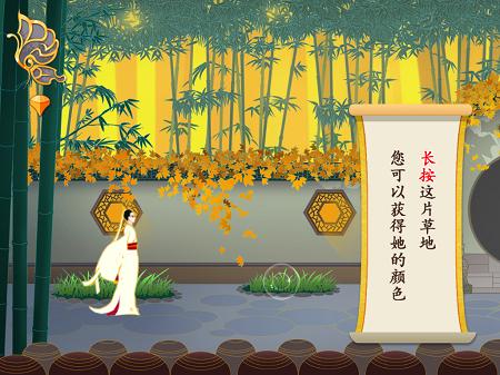 在玩法上《惊梦》同样是运用了色彩元素这一主题。从一处取色,再将所取颜色用到另一物上去,最终使场景与所给诗句画卷相同。这游戏取色的提示是诗画,用色的提示也是诗画。